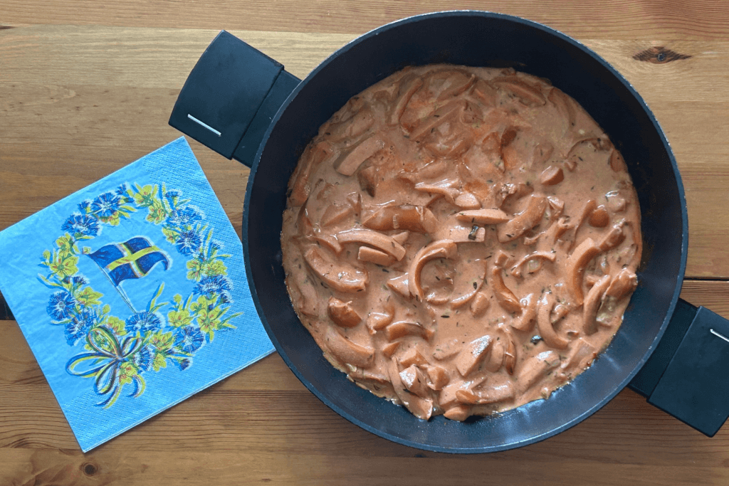 A Korvstroganoff hagyományosan falukorvval készül – enyhén füstölt, patkó alakú virsli vagy főzőkolbász. Nevében ugyan orosz eredetű a „Stroganoff” (klasszikus tejszínes, mustáros húsétel), de a svéd változat egyszerűsített, nincs benne gomba, se uborka, a gyerekbarát ízekre és egyszerűségre törekszik. A Korvstroganoff villámgyors étel, pont el lehet készíteni annyi idő alatt, míg a köretként tálalt rizs megfő hozzá. Ami azért külön érdekes, mert Svédországban is inkább krumplit esznek, de ehhez kivételesen a rizs az alap. A korvstroganoff a svédeknek olyan, mint nekünk a tarhonyás hús vagy a milánói makaróni – egyszerű, otthonos, gyerekkorból ismerős. Gyerekek generációi nőttek fel rajta.