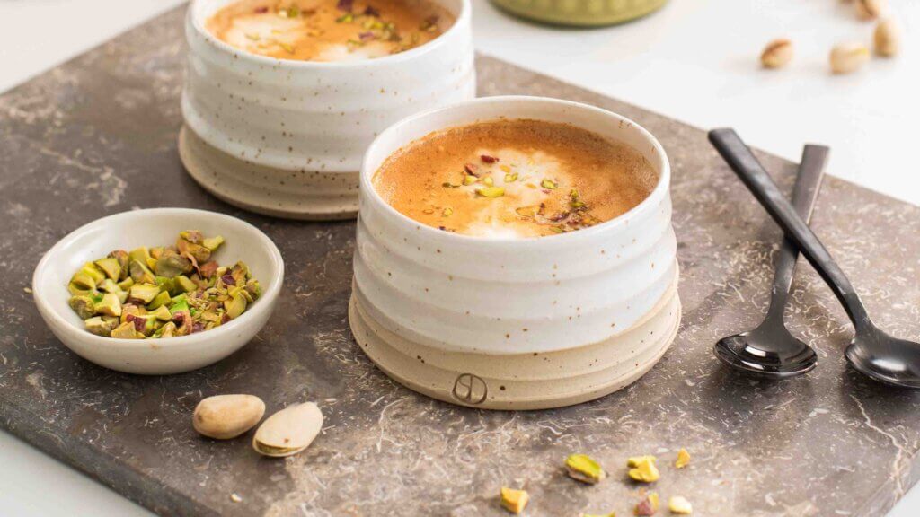 Melegítsd fel a tejet, add hozzá a pisztáciapasztát és az édesítőt, majd keverd addig, míg krémes lesz. Keverd össze a kávéval, és díszítsd egy kevés durvára vágott pisztáciával. Egyszerre elegáns és otthonos – mint egy nordic design kávéspohár a tenyeredben.
