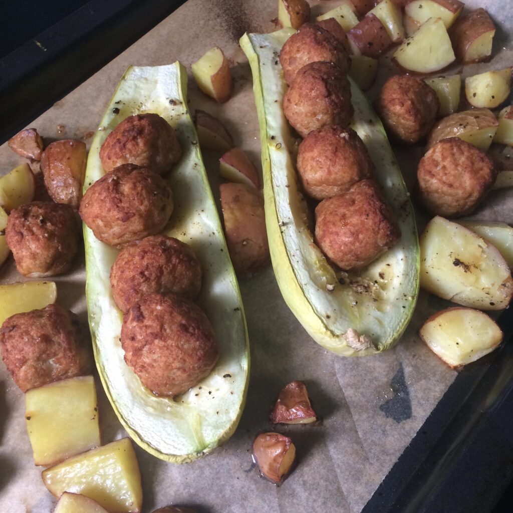 Megmostam és kettévágtam a tököt, a magházát kivájtam. Egy tepsibe sütőpapírt fektettem, és ráraktam a két tökfelet. Besóztam, beborsoztam a zöldség mindkét felét, és a mélyedéseibe beleültettem a húsgombócokat. Az új burgonyákat lecsutakoltam, feldaraboltam, átforgattam olajban, sóztam borsoztam és a tök mellé halmoztam. Nagyjából húsz perc alatt készre sütöttem. Tálaláskor megszórtam friss petrezselyemmel.